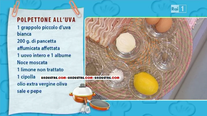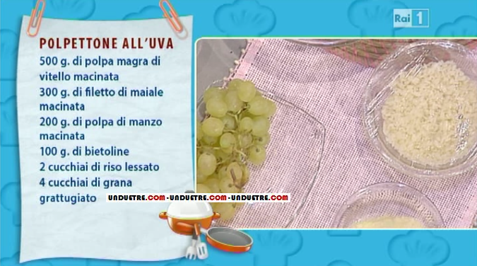 Vi proponiamo una gustosa ricetta realizzata in una delle ultime edizioni de La prova del cuoco. Antonella, acclamata dai bimbi che animano gli spalti, saluta Claudio e lo lascia nelle grinfie di Anna Moroni, pronta con la sua ricetta della domenica. Oggi prepara il polpettone all’uva.