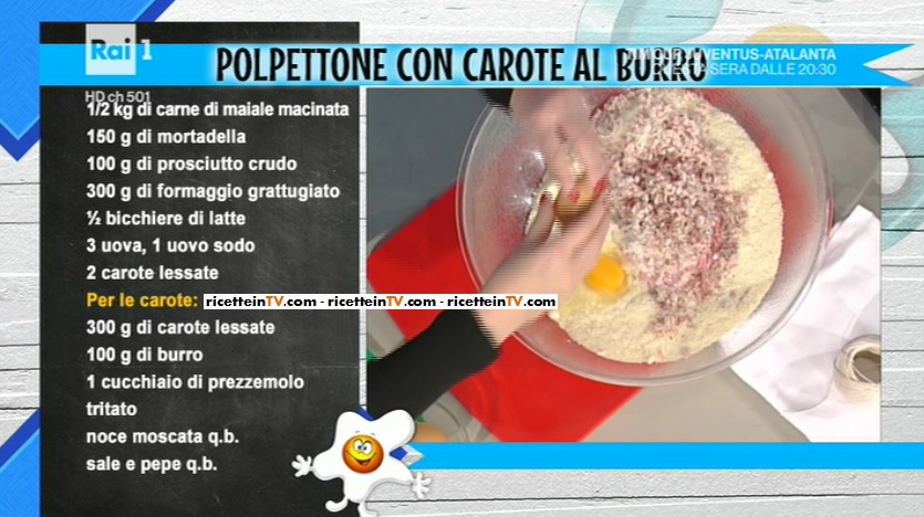 - 1/2 Kg carne di maiale macinata, 150 g mortadella, 100 g prosciutto crudo, 300 g formaggio grattugiato, 1/2 bicchiere di latte, 3 uova, 1 uovo sodo, 2 carote lesse