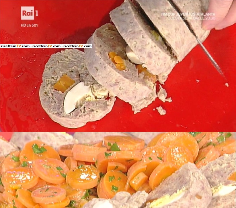 Prendiamo il macinato ed uniamo il prosciutto e la mortadella tritati al coltello, il formaggio grattugiato, le uova ed il latte. Lavoriamo con le mani, fino ad ottenere un composto omogeneo. Inumidiamo un canovaccio pulito (ma senza ammorbidente); mettiamo sopra l’impasto, formando una sorta di rettangolo. Al centro, mettiamo le carote lesse a pezzettoni ed un uovo sodo a spicchi. Copriamo con il restante impasto ed arrotoliamo, in modo da dare la forma di un polpettone. Leghiamo le estremità del canovaccio ed immergiamo nel brodo. Copriamo e lasciamo cuocere 1 ora, 1 ora e mezza.