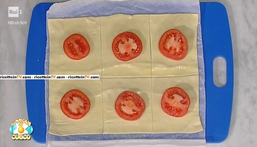 Srotoliamo un rotolo di pasta sfoglia rettangolare e ne ricaviamo 6 quadratoni. Spennelliamo tutta la superficie con uovo sbattuto. Posizioniamo al centro di ciascun quadrato di sfoglia una fetta di pomodoro. Condiamo con pepe e sale. Inforniamo per 20 minuti a 200°.