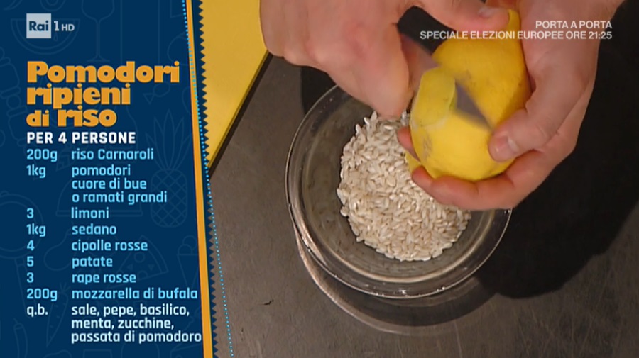 Tra gli ingredienti è indicata la mozzarella di bufala, ma in trasmissione non se ne fa cenno. Probabilmente, andrà tagliata a fette e posizionata una fetta su ogni pomodoro, quindi andrà fatto gratinare il tutto per altri 10 minuti in forno.