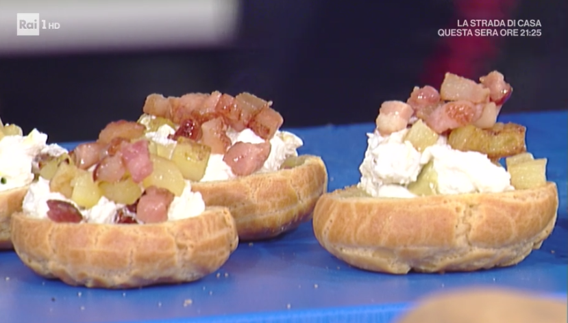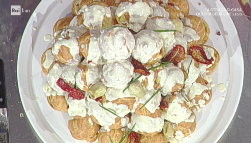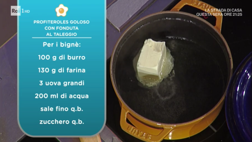 Prosegue il menu di oggi con la portata pensata da Andrea Mainardi. Anche in questo caso, prepariamo un piatto ‘enorme’, che Andrea consiglia di proporre a Natale, come antipasto scenografico. Prepariamo i profiteroles goloso con fonduta di taleggio.