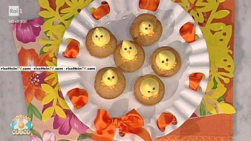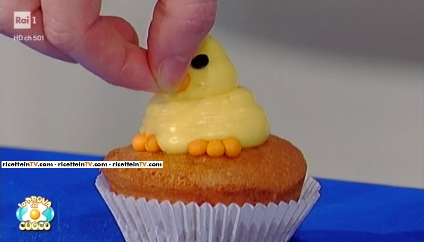 Sul cupcake freddo, posizioniamo i piedini. Facciamo, sopra i piedini, un ciuffo di crema. Completiamo con gli occhietti (gocce di cioccolato) ed il becco.