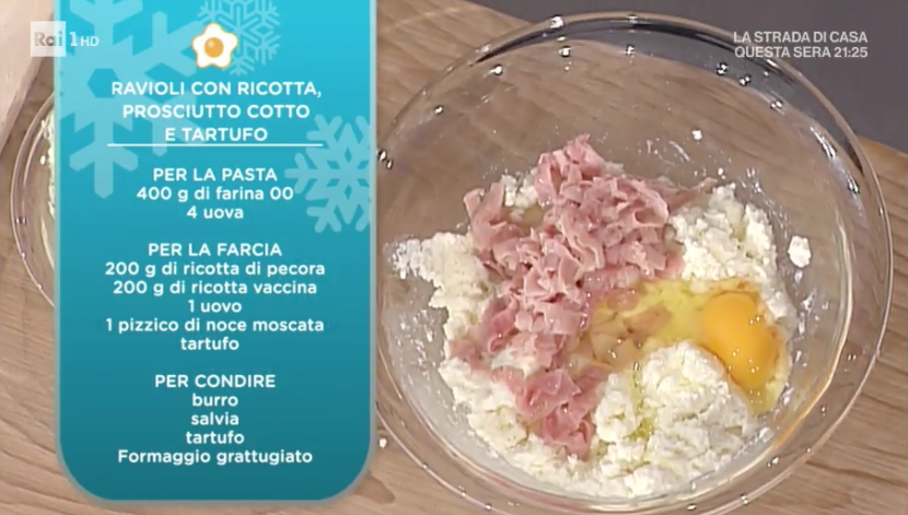 Ripieno: mescoliamo la ricotta, di pecora e mucca, con l’uovo ed il formaggio grattugiato. In padella, facciamo scaldare il prosciutto cotto a listarelle con una noce di burro. Uniamo alla ricotta e profumiamo con noce moscata. Possiamo scegliere di tritare finemente con il mixer il prosciutto cotto ripassato. Mescoliamo per bene.