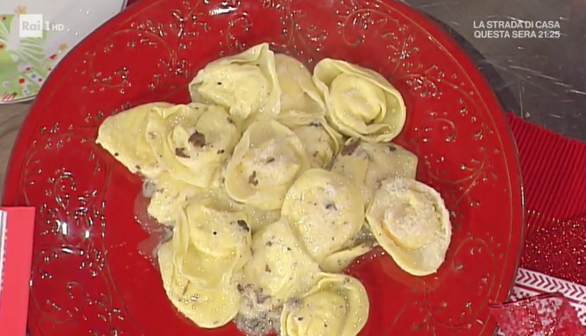 Tiriamo la sfoglia sottile. Ritagliamo dei dischi con un coppapasta. Al centro di ogni disco mettiamo una noce di ripieno. Richiudiamo la sfoglia sul ripieno, chiudiamo a mezzaluna sigillando i bordi. Pieghiamo a tortellone. Altrimenti lasciamo a mezzaluna. Lessiamo in acqua bollente e salata.