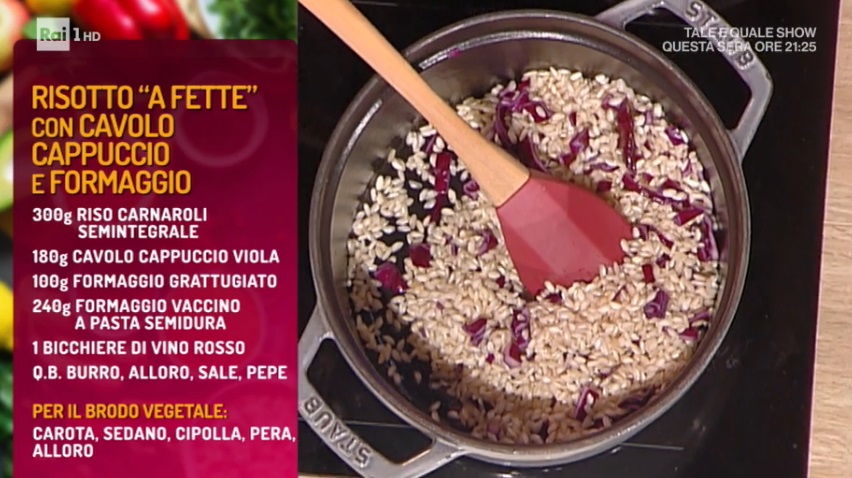 - 300 g riso carnaroli semintegrale, 180 g cavolo cappuccio viola, 100 g formaggio grattugiato, 240 g formaggio vaccino a pasta semidura, 1 bicchiere di vino rosso, burro, alloro, sale, pepe