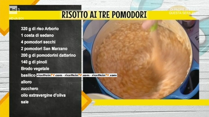 - 320 g riso Arborio, 1 costa di sedano, 4 pomodori secchi, 2 pomodori San Marzano, 200 g pomodorini datterino, 140 g pinoli, brodo vegetale, basilico, alloro, zucchero, sale, olio evo