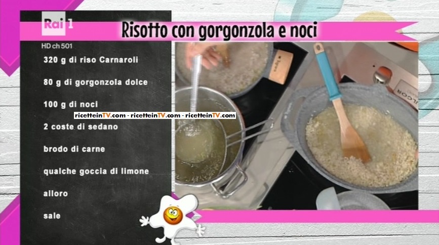 - 320 g riso Carnaroli, 80 g gorgonzola dolce, 100 g noci, 2 coste di sedano, brodo di carne, qualche goccia di limone, alloro, sale