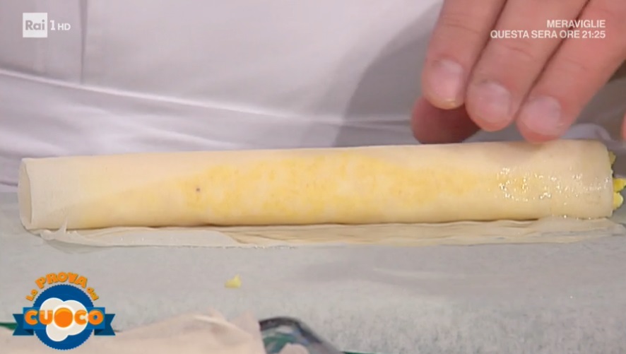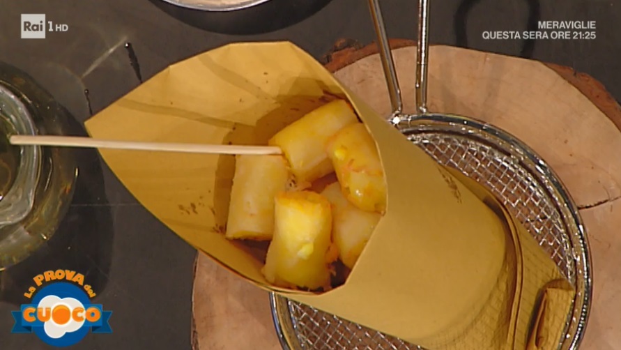 Formiamo dei salsicciotti con il riso freddo e li adagiamo su fogli di pasta brick. Arrotoliamo la pasta sul riso e formiamo dei cannelloni. Avvolgiamo nella carta forno e congeliamo. Tagliamo a tocchetti di 6 cm circa. Immergiamo in olio profondo e ben caldo per pochi istanti. Asciughiamo su carta assorbente.