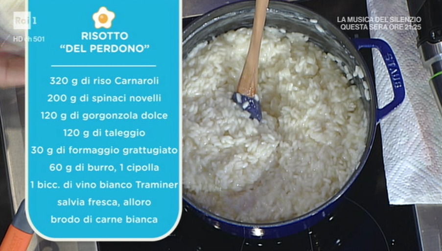 Ad aprire una nuova settimana de La prova del cuoco è la ricetta di Sergio Barzetti. Mister Alloro torna al primo amore, proponendo uno dei suoi imperdibili risotti. Prepariamo il risotto del perdono.