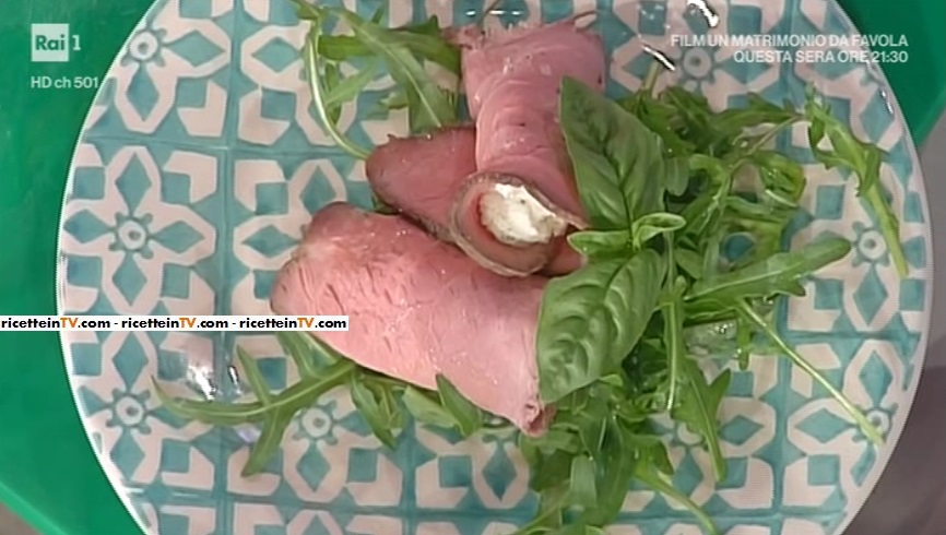 Serviamo con una crema di caprino. Lavoriamo il caprino con un filo d’olio, le erbette aromatiche tritate e del succo di limone. Ne mettiamo una cucchiaiata al centro della fetta di roast beef ed arrotoliamo, in modo da formare un involtino.