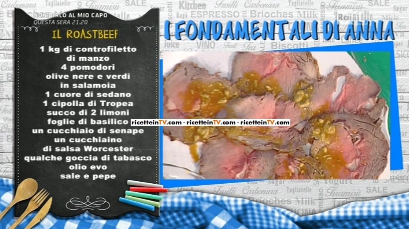 Chiediamo al macellaio un controfiletto di manzo da almeno 1 Kg; lo leghiamo con dello spago, come fosse un arrosto, lo massaggiamo con sale e pepe. In padella, scaldiamo un filo d’olio, quindi rosoliamo il controfiletto su tutti i lati, in modo da ‘sigillarlo’. Utilizziamo due palette, in modo da non bucare la carne. Trasferiamo in un tegame, lo copriamo e inforniamo. Per ogni Kg di carne, si mette in forno a 200° per 20 minuti; poi, forno aperto e spento per altri 10 minuti. Nel caso aveste un termometro, il roastbeef deve raggiungere la temperatura di 50-55° al centro. Anna consiglia di servire con un’insalata di pomodori, sedano, olive nere e verdi denocciolate tagliati a cubetti, cipolla di tropea precedentemente ammollata in acqua e sale e basilico; a parte, misceliamo succo di limone, tabasco, senape ed olio. Versiamo sull’insalata e mescoliamo. Serviamo il roastbeef a fette con l’insalata sopra.