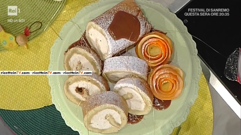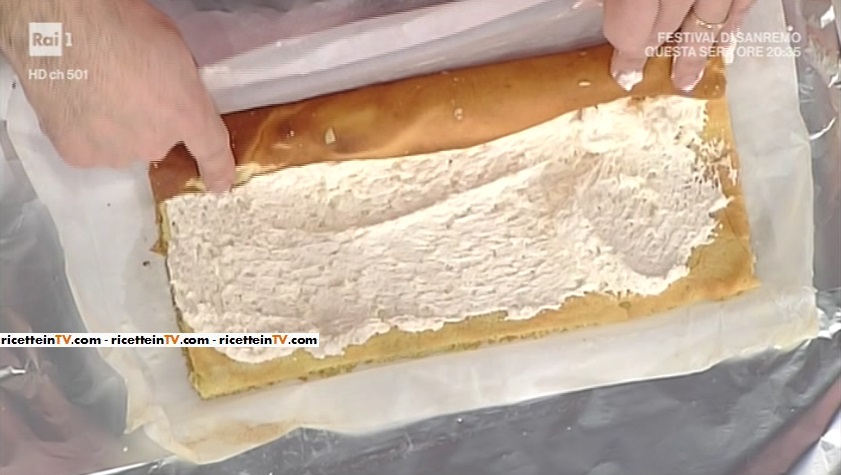 Spalmiamo la crema ottenuta sul biscotto ed arrotoliamo, stretto, aiutandoci con la carta forno. Fermiamo il rotolo con la carta alluminio e lasciamo in frigorifero. Serviamo a fette.