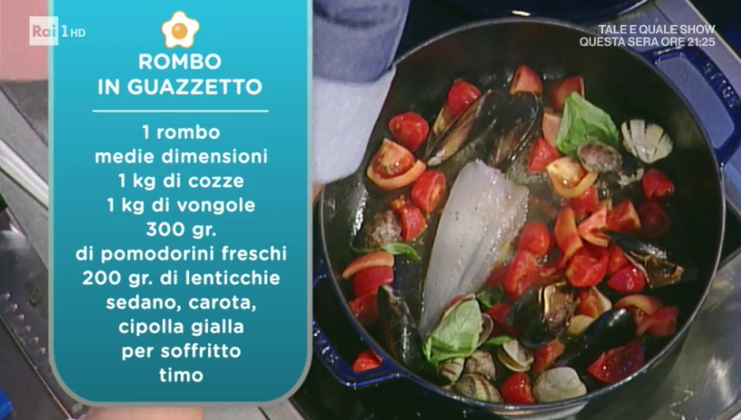- 1 rombo medie dimensioni, 1 Kg cozze, 1 Kg vongole, 300 g pomodorini, 200 g lenticchie, sedano, carota, cipolla, timo o rosmarino