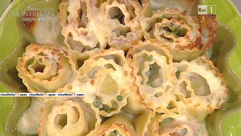 Lessiamo per circa 7 minuti le lasagne in acqua bollente e salata con un filo d’olio; la facciamo asciugare su un canovaccio pulito o su dei fogli di carta forno. In padella, scaldiamo l’olio con il cipollotto ed i piselli surgelati; facciamo cuocere per circa 10 minuti. Saliamo e pepiamo. Grattugiamo la scamorza e prepariamo la besciamella, che dev’essere abbastanza fluida, non troppo denza (basta dimezzare la dose della farina della vostra ricetta di fiducia). Sovrapponiamo due lasagne ricce, in modo da ottenere una lunga striscia; spalmiamo con abbondante besciamella; disponiamo sopra i piselli, il prosciutto affettato, il formaggio grattugiato e la caciotta grattugiata; arrotoliamo, in modo da formare dei rotoli che disponiamo in una tortiera imburrata; le disponiamo strette, una di fianco all’altra, in modo che non si aprano. Bagniamo con la besciamella, spolveriamo con formaggio grattugiato, scamorza grattugiata e inforniamo 30 minuti a 180°