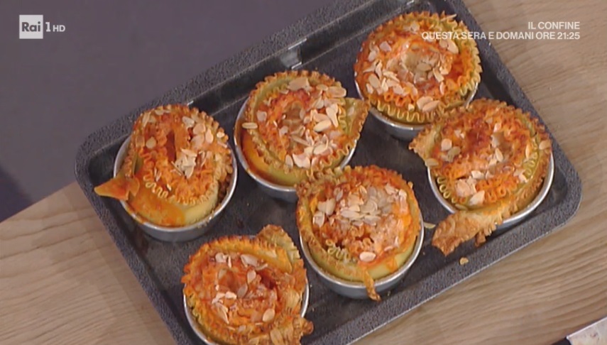Sovrapponiamo 2 lasagne lessate, spalmiamo un po’ di composto di ricotta sopra ed arrotoliamo. Mettiamo le rose negli stampini monoporzione imburrati e spolverati con pangrattato. Copriamo con un po’ di sugo e spolveriamo con le mandorle a lamelle ed inforniamo a 180° per 20-25 minuti.