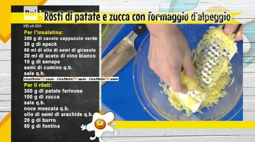 Dopo una lunga assenza, dalle montagne, arriva Marcus Holzer, che dopo aver pubblicizzato i mercatini di Natale di San Candido, prepara il rosti di patate e zucca con formaggio d’alpeggio.