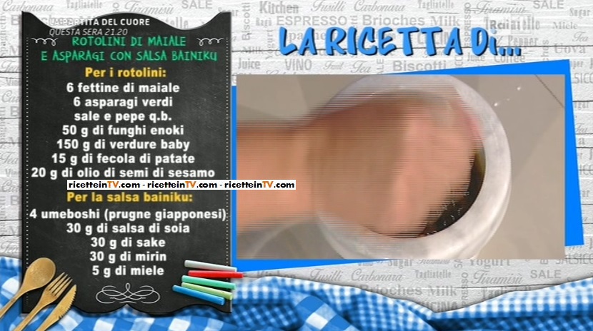 - Per i rotolini: 6 fettine di maiale, 6 asparagi verdi, sale e pepe, 50 g funghi enoki, 150 g verdure baby, 15 g fecola di patate, 20 g olio di semi di sesamo