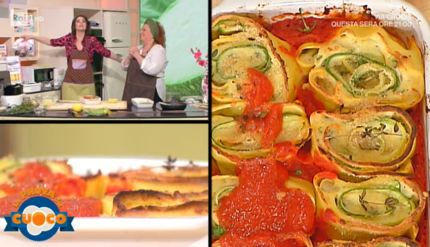 Spalmiamo il composto sul letto di pasta all’uovo e zucchine ed arrotoliamo stretto. Prepariamo la vaporiera, con il brodo vegetale. Inseriamo all’interno il rotolo ottenuto e lasciamo cuocere. Oppure, lo avvolgiamo nella pellicola e nel canovaccio ed immergiamo in acqua bollente. Lasciamo cuocere per 30 minuti. Una volta cotto, lasciamo intiepidire e tagliamo a fette. Sporchiamo il fondo di una pirofila con la salsa di pomodoro. Adagiamo all’interno le fette di pasta farcita. Copriamo con altra salsa e passiamo in forno a gratinare.