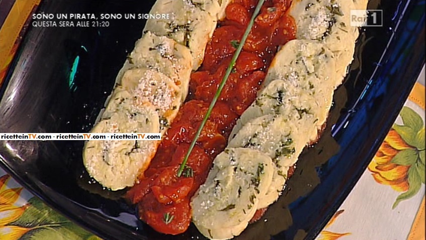 Schiacciamo le patate lesse, che non devono essere troppo bagnate; uniamo la farina, un tocco di burro, il formaggio grattugiato, un pizzico di noce moscata (e di sale) e le uova: mescoliamo per bene, in modo da ottenere un composto omogeneo. Tritiamo le erbe aromatiche con lo scalogno. Prepariamo un sugo di pomodoro, con pelati, un filo d’olio ed uno spicchio d’aglio. Tagliamo un foglio di carta forno; stendiamo alla base il composto di patate, dando una forma rettangolare; disponiamo sopra il trito di erbe e scalogno; richiudiamo, in modo da ottenere un rotolo. Con le dosi indicate, Luisanna consiglia di fare due rotoli. Avvolgiamo per bene la carta forno, quindi sigilliamo con la pellicola, anche 3-4 fogli di pellicola. Lo immergiamo in abbondante acqua bollente per mezz’ora. Lasciamo raffreddare, quindi ‘spacchettiamo’ e tagliamo a fette, servendolo con il sugo di pomodoro.