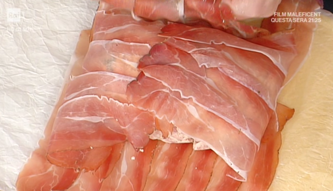 Su della carta forno sovrapponiamo le fette di speck formando una specie di letto, ne mettiamo 4 in cima e 4 in fondo. Posizioniamo al centro il polpettone e richiudiamo le fette di speck. Lo leghiamo con lo spago, mettiamo in una pirofila. Aggiungiamo un pochino di brodo, un bicchiere di vino bianco e inforniamo a 180° per un’ora. Se necessario aggiungiamo del brodo.