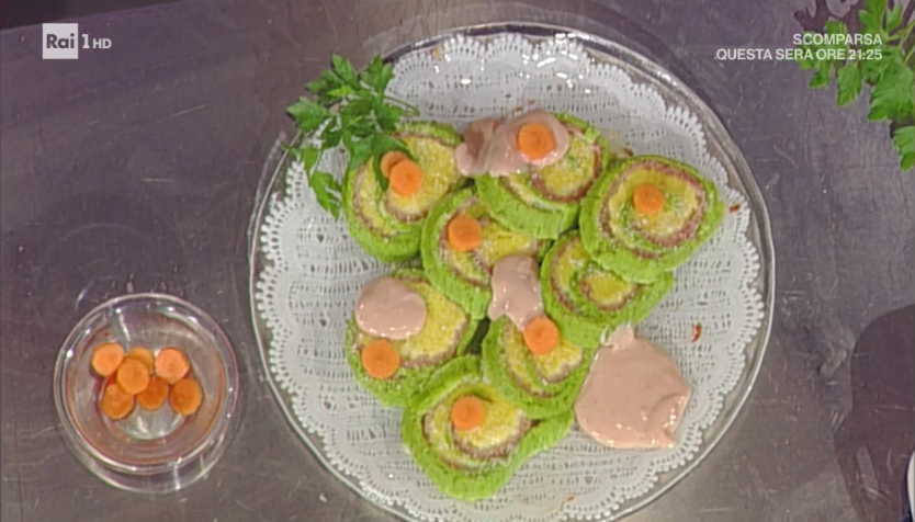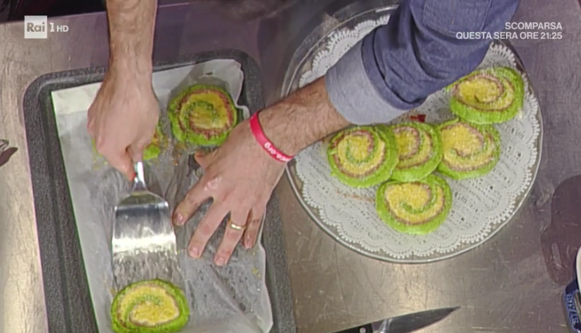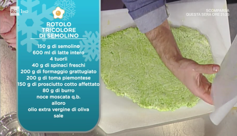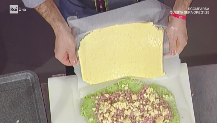 Stendiamo un foglio di carta forno. Lo ungiamo con un filo d’olio e sovrapponiamo un altro foglio di carta, in modo da ungerlo uniformemente. Togliamo il secondo foglio. Sul primo foglio, ben unto, mettiamo il composto di semolino verde; copriamo con l’altro foglio di carta unto e stendiamo allo spessore di 1 cm, in modo da ottenere un rettangolo. Mettiamo sopra il prosciutto cotto tritato (al mixer) ed il formaggio toma tritata allo stesso modo.