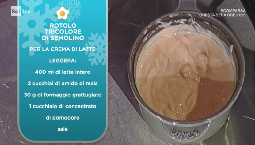 - 150 g semolino, 600 ml latte intero, 4 tuorli, 40 g spinaci freschi, 200 g formaggio grattugiato, 200 g toma piemontese, 150 g prosciutto cotto, 80 g burro, noce moscata, alloro, olio, sale