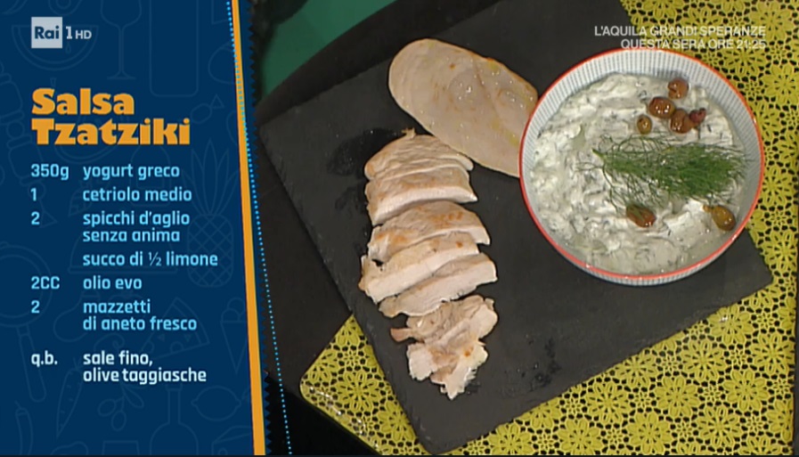 • Salsa Tzatziki: 350 g yogurt greco, 1 cetriolo medio, 2 spicchi d’aglio, succo di mezzo limone, 2 cc olio evo, 2 mazzetti di aneto fresco, sale, olive