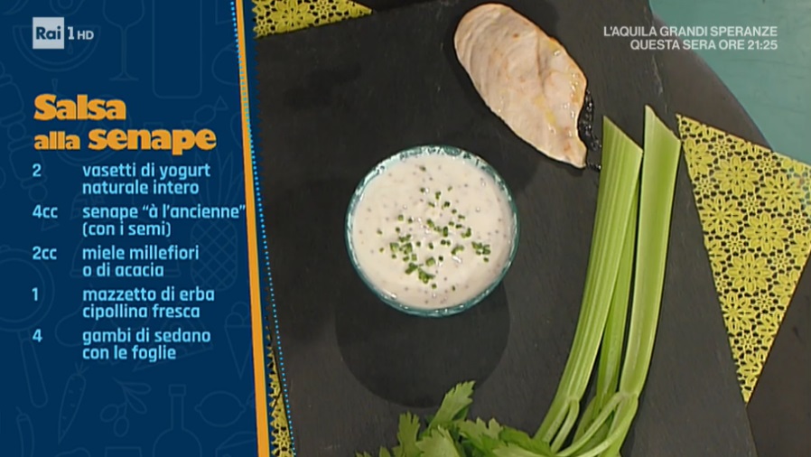 • Salsa allo yogurt e senape: 2 vasetti di yogurt al naturale intero, 4 cc senape con i semi, 2 cc miele, 1 mazzetto di erba cipollina, 4 gambi di sedano con le foglie