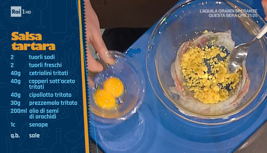 • Salsa tartara: 2 tuorli sodi, 2 tuorli freschi, 40 g cetriolini tritati, 40 g capperi sott’aceto, 40 g cipollotto tritato, 30 g prezzemolo, 200 ml olio di semi, 1 c senape, sale