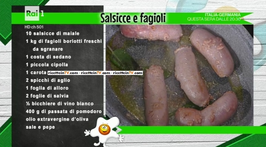 - 10 salsicce di maiale, 1 Kg fagioli borlotti freschi da sgranare, 1 costa di sedano, 1 piccola cipolla, 1 carota, 2 spicchi di aglio, 1 foglia di alloro, 2 foglie di salvia, 1/2 bicchiere di vino bianco, 400 g passata di pomodoro, olio evo, sale e pepe