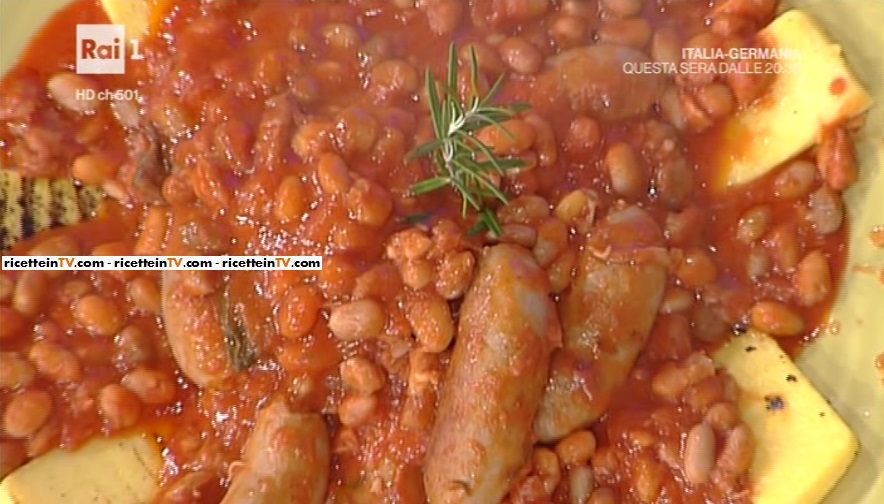 Uniamo i fagioli scolati al sugo e salsicce e facciamo insaporire, sul fuoco, qualche minuto. Serviamo con della polenta grigliata.