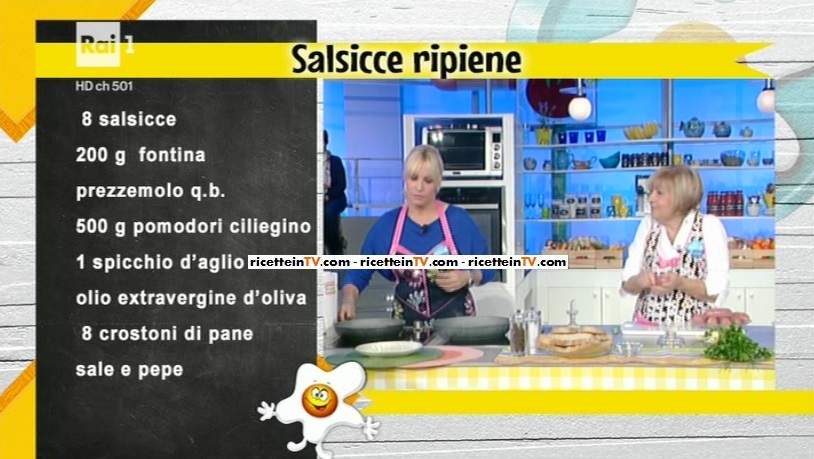 - 8 salsicce, 200 g fontina, prezzemolo, 500 g pomodori ciliegino, 1 spicchio d’aglio, olio evo, 8 crostoni di pane, sale e pepe