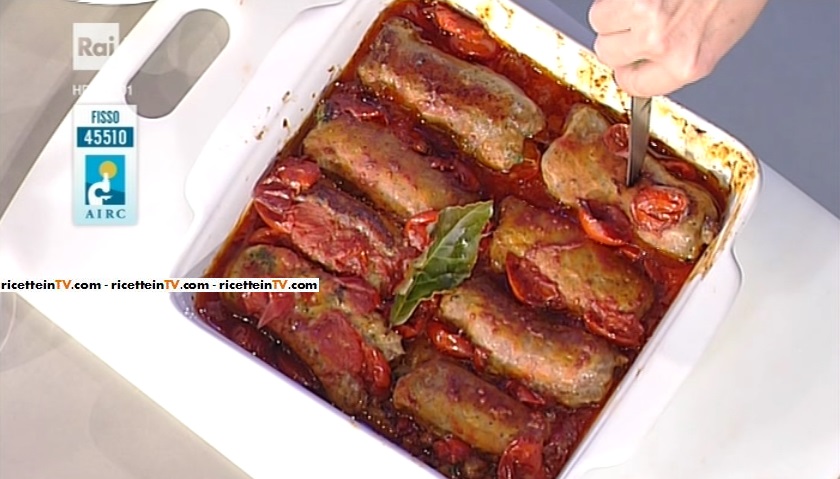 Intanto, tagliamo i pomodorini a metà e li facciamo cuocere, in padella, con olio ed aglio. Dobbiamo ottenere una sorta di sugo di pomodoro rustico. Uniamo alle salsicce ed inforniamo a 180° per 20 minuti.