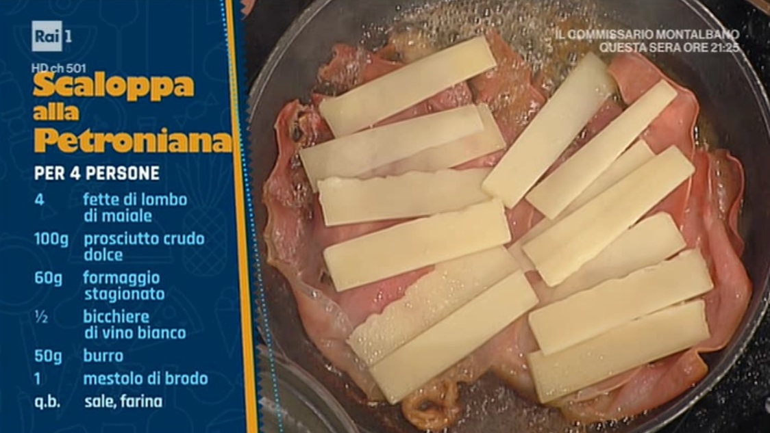 Una volta ben dorate, sfumiamo con il vino bianco e, quando è evaporato, mettiamo sopra ad ogni fetta di carne una fetta di prosciutto crudo e delle fettine di formaggio. Uniamo un mestolo di brodo e facciamo cuocere qualche minuto.