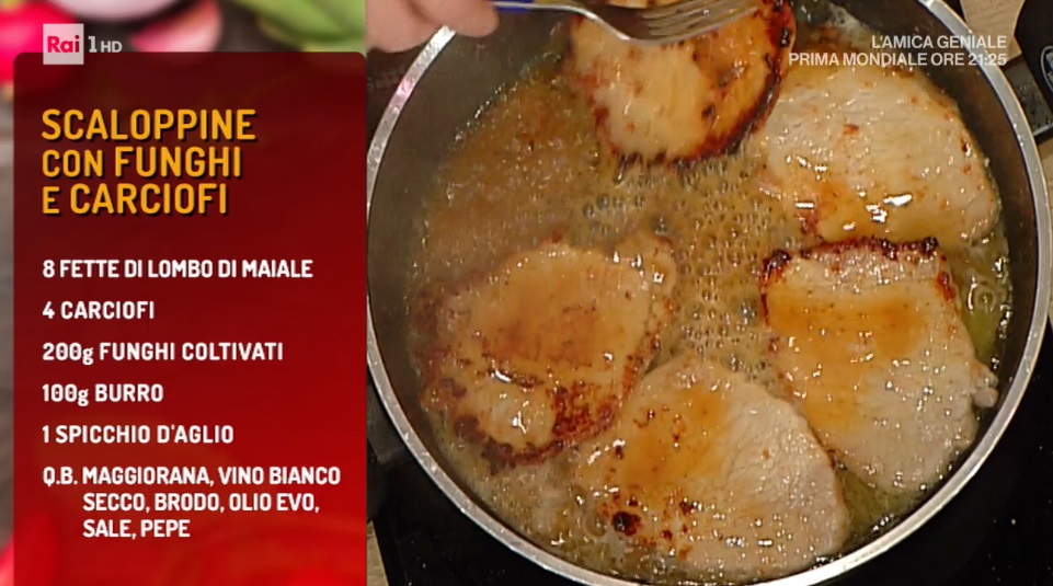 - 8 fette di lombo di maiale, 4 carciofi, 200 g funghi coltivati, 100 g burro, 1 spicchio di aglio, maggiorana, vino bianco, brodo, olio evo, sale, pepe