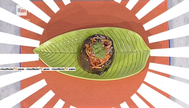 Inseriamo gli spaghetti all’interno della melanzana fritta. Spolveriamo con caciocavallo stagionato e completiamo con una cucchiaiata di pesto.