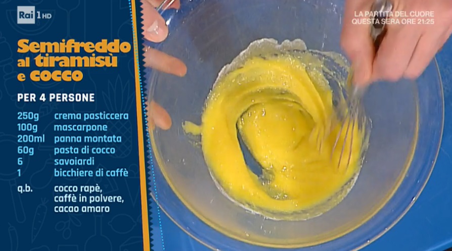 Duello iniziale a base di tiramisù. Non il classico tiramisù, però, ma una versione estiva del celebre dolce al cucchiaio. A battersi sono Napoli e Bergamo, ovvero Totaro e Marco Rossi. Il cuoco napoletano propone il semifreddo al tiramisù e cocco.