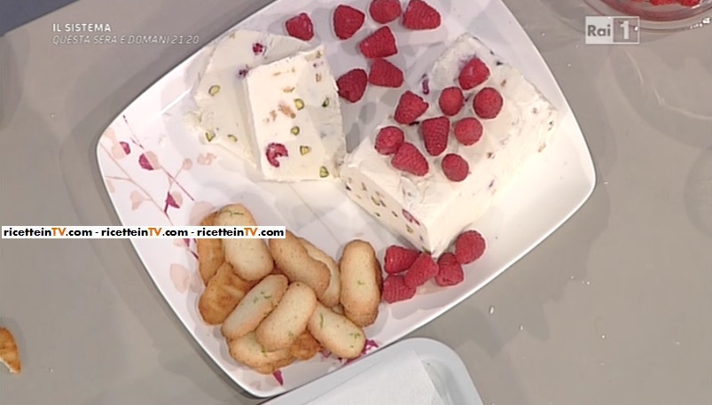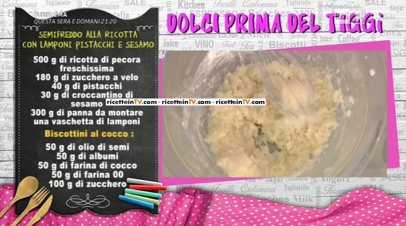 Montiamo la panna (non troppo: dev’essere semimontata); a parte, setacciamo la ricotta e la lavoriamo con lo zucchero a velo; incorporiamo, delicatamente, la panna semimontata al composto di ricotta. Tritiamo al coltello i pistacchi con il sesamo e li uniamo alla crema di ricotta e panna, insieme ai lamponi. Trasferiamo in uno stampo da plumcake di 18-20 cm, foderato di carta o coperto da pellicola, e mettiamo in freezer per 2-3 ore. Per la ricetta dei biscottini al cocco, clicca qui.