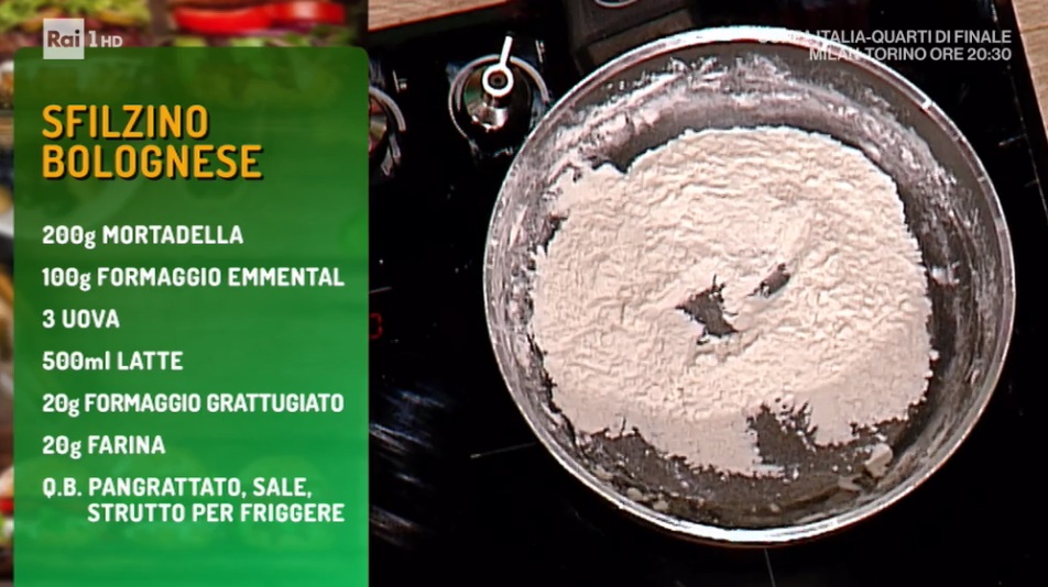 - 200 g mortadella, 100 g formaggio emmental, 3 uova, 500 ml latte, 20 g formaggio grattugiato, 20 g farina, pangrattato, sale, strutto per friggere