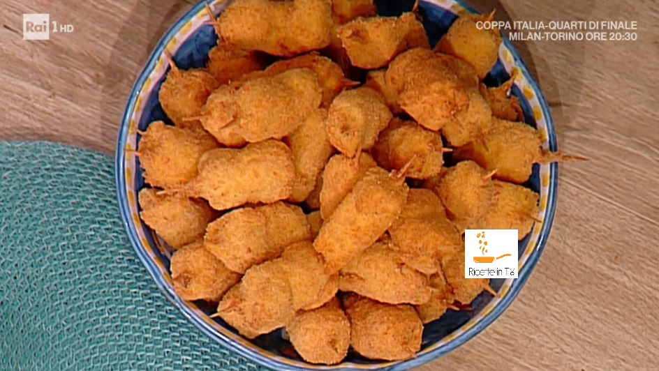 Passiamo, quindi, gli spiedini nella farina, nel latte addensato, nel pangrattato, quindi nelle uova sbattute e ancora nel pangrattato. Friggiamo in abbondante strutto ben caldo fino a doratura. Scoliamo su carta assorbente e serviamo caldi.