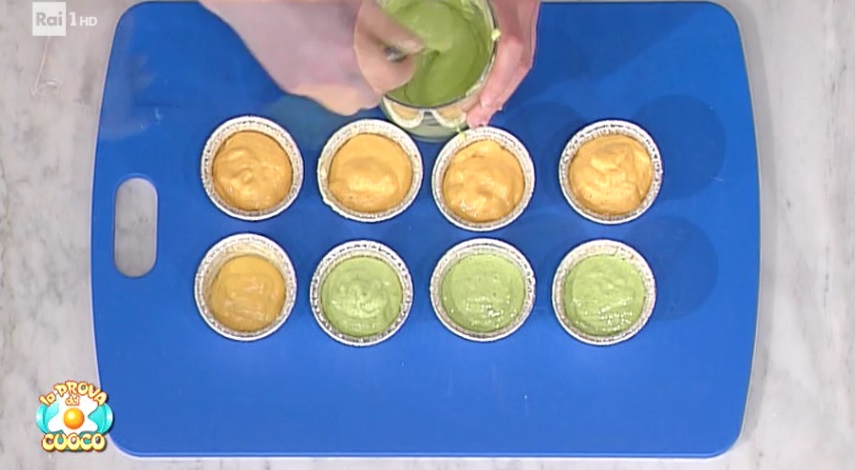 Imburriamo e spolveriamo con del pangrattato degli stampini monoporzione. Riempiamo 1/3 con il composto alle carote e sovrapponiamo uno strato di composto verde (un altro terzo dell’altezza totale dello stampino).