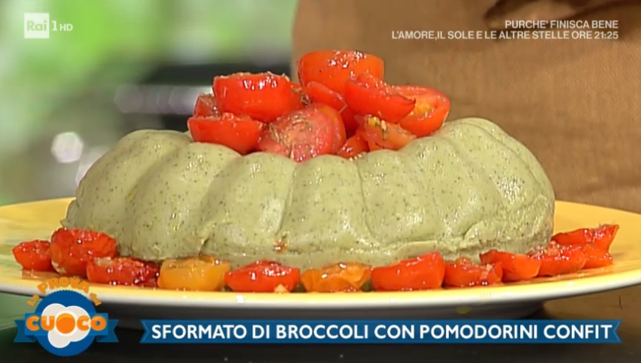 Passiamo allo sformato. Lessiamo il broccolo, lo scoliamo e lo mettiamo nel mixer e lasciamo raffreddare. Frulliamo fino ad ottenere una purea. Aggiungiamo quindi le uova intere, la panna, lo yogurt, noce moscata ed una presa di sale. Frulliamo ancora. Versiamo il composto ottenuto (piuttosto liquido) all’interno di una tortiera per ciambella ben imburrata. Posizioniamo la teglia all’interno di un’altra teglia riempita con dell’acqua calda. Cuociamo a bagnomaria, in forno preriscaldato a 170° per 40 minuti.