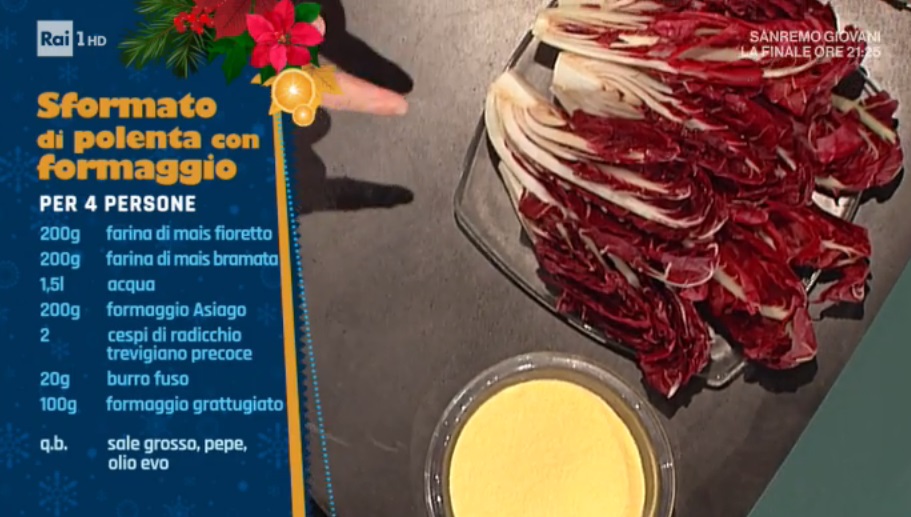 • 200 g farina di mais fioretto, 200 g farina di mais bramata, 1,5 l acqua, 200 g formaggio Asiago, 2 cespi di radicchio trevigiano precoce, 20 g burro fuso, 100 g formaggio grattugiato, sale, pepe, olio