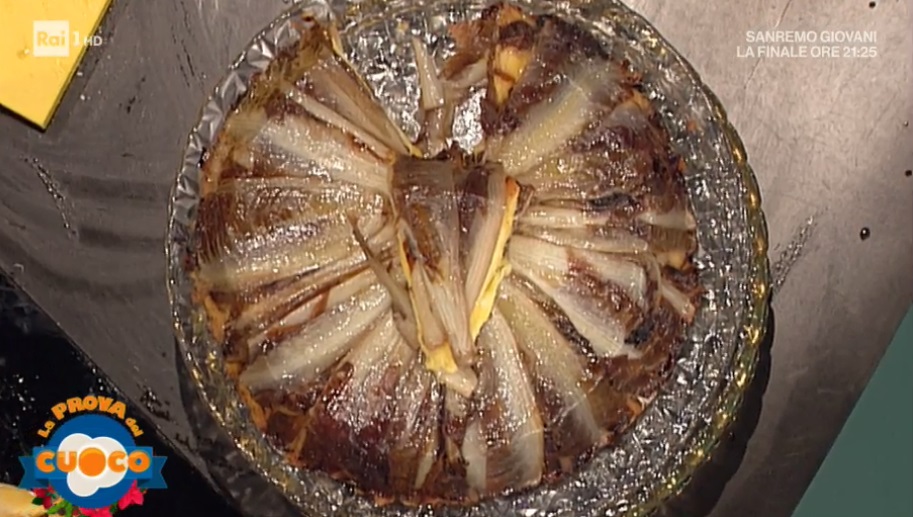 Tagliamo ciascun cespo di radicchio in 4 spicchi. Saliamo gli spicchi e li condiamo con dell’olio. Disponiamo su una teglia e mettiamo in forno preriscaldato a 250° (massimo della temperatura). Dopo 10 minuti di cottura, abbassiamo a 100° e lasciamo stufare ulteriormente.