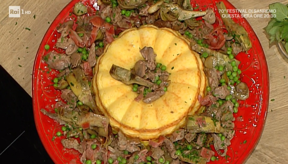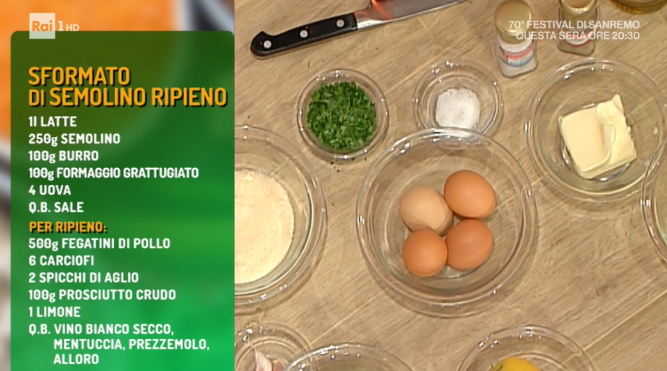 sformato di semolino ripieno di Luisanna MesseriSi ricongiunge, finalmente, la coppia delle ‘amiche dell’apertivo’, formata da Luisanna Messeri e Natalia Cattelani. Le due cuoche, colonne portanti del cast de La prova del cuoco, sono le protagoniste delle prove individuali. Se Natalia prepara uno dei suoi dolci, Luisanna ci stupisce con una ricetta storica, lo sformato di semolino ripieno.