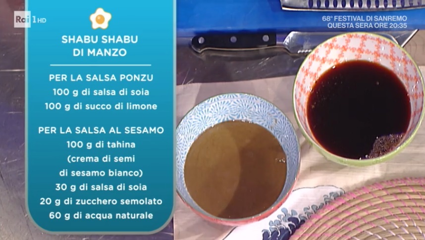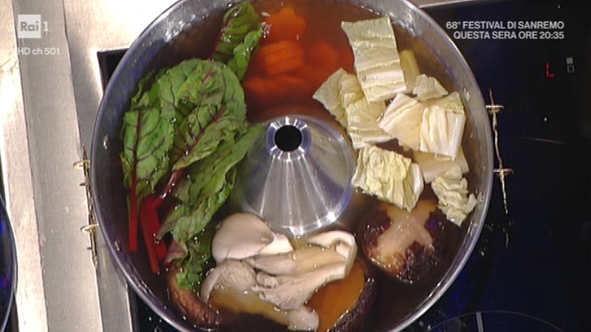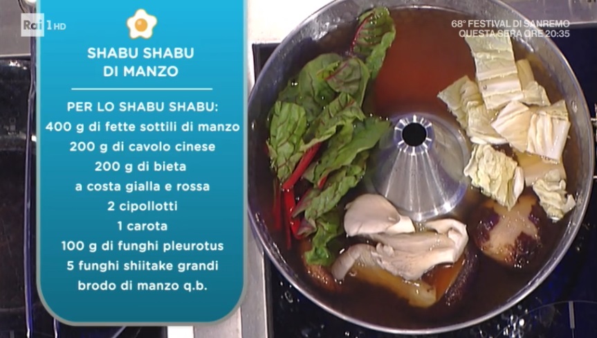 - Shabu Shabu: 400 g fette sottili di manzo, 200 g cavolo cinese, 200 g bieta a coste gialle e rosse, 2 cipollotti, 1 carota, 100 g funghi pletorus, 5 funghi shiitake grandi, brodo di manzo