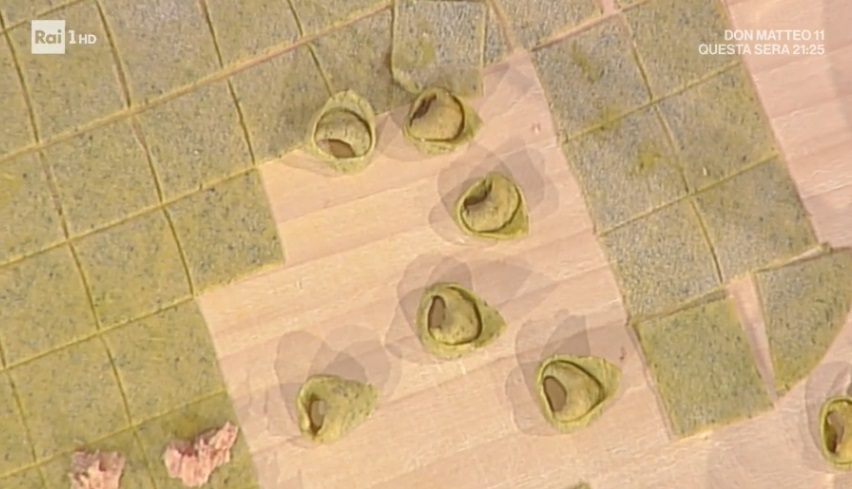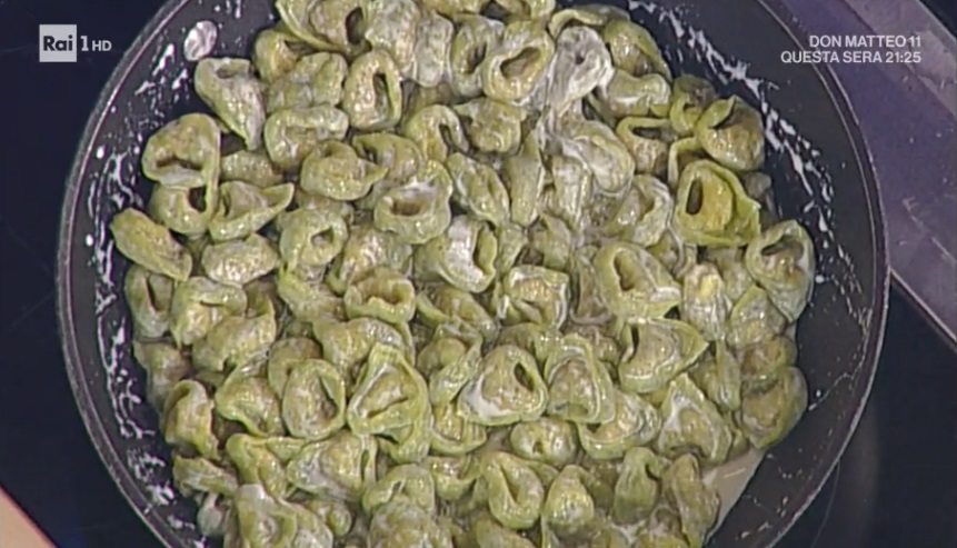 Prepariamo la sfoglia impastando la farina con le uova e gli spinaci sbollentati e tritati finemente. Avvolgiamo nella pellicola e facciamo riposare mezz’ora. Tiriamo la sfoglia sottile. Ricaviamo dei quadratini. Formiamo al centro di ciascun quadratino una nocina di ripieno. Richiudiamo a formare un tortellino poco più grosso dell’originale. Lessiamo in acqua salata e bollente.
