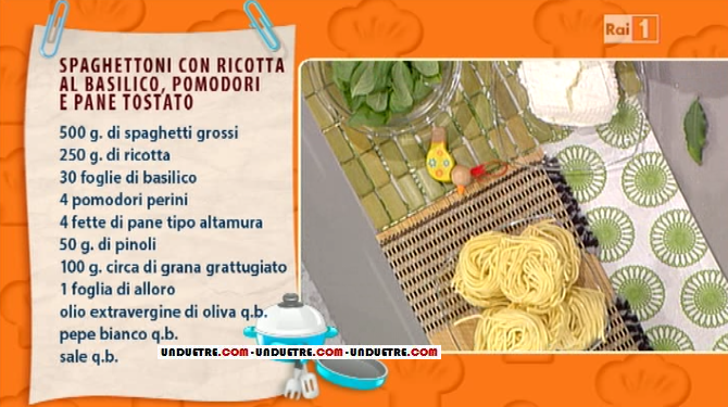 Vi proponiamo una gustosa ricetta realizzata in una delle ultime edizioni de La prova del cuoco. La canzoncina de ‘L’appetito vien mangiando‘  introduce mister alloro Sergio Barzetti. La ricetta di oggi è spaghettoni con ricotta al basilico, pomodori e pane tostato.