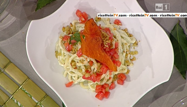 La ricetta degli spaghettoni con ricotta al basilico, pomodori e pane tostato di Sergio Barzetti – La prova del cuoco